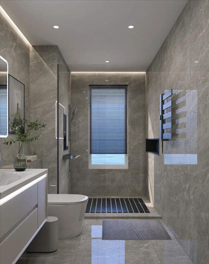 洗手间的细节也值得说一说。整个空间用的是灰色仿石材瓷砖搭配玻璃淋浴房,洗漱区是双台盆设计,他说这样早上赶时间的时候也不用抢位置。镜柜是内嵌的,收纳能力特别强,瓶瓶罐罐全都藏得严严实实。