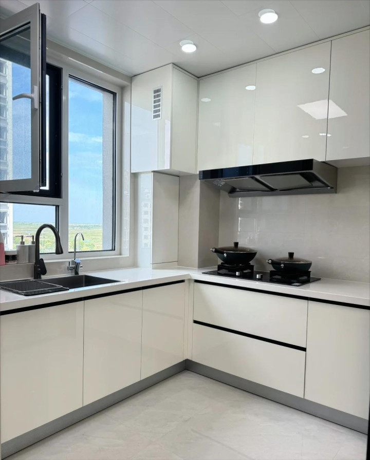 厨房面积不大,但五脏俱全。橱柜是定制的L型布局,全部选用了淡奶油色调,整体显得特别干净利落。灶台和洗菜区分开布置,台面铺了白色岩板,不仅防油防污,而且特别好打理。他说自己最讨厌厨房油腻腻,所以家里做饭一定要及时收拾,锅碗瓢盆都藏在抽屉里,台面几乎看不到任何杂物,真的是一尘不染。