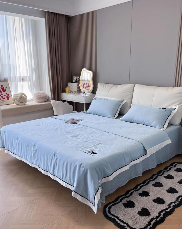 卧室的风格相对更柔和一些,主色调是米白和浅咖,床头背景墙是软包材质,整面墙都能靠着看书、玩手机。床品很讲究,全部是高支棉,颜色看着温柔又治愈。床头柜上摆着一盏鹅蛋型的小夜灯,亮起的时候很有氛围感。